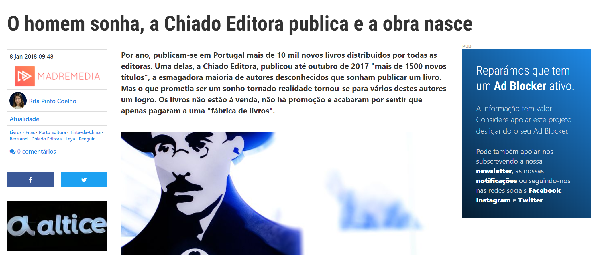 Mas afinal o que é a Chiado Editora/Books (mudança de nome interessante, não é?)? Porque se fala tanto nela? Qual a fama que ela tem ganho? Pois bem, é neste artigo publicado a janeiro de 2018, que numa série de investigações resultantes no depoimento de alguns autores, a jornalista Rita Pinto Coelho vos revela afinal o que é esta “editora”. Aviso-vos já: foi um grande caminho que eles percorreram desde que se estabeleceram no mercado até ao ano da peça jornalística, mas vão ficar surpresos…