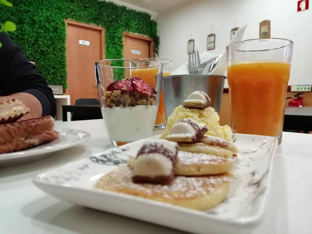 Confesso que fiquei surpreendido por este brunch. Com um custo de 5,90€, tivemos direito a uma tosta – poderíamos escolher uma cujo valor não ultrapassasse os 3,20€ -, um iogurte com granola e uma fruta à escolha (banana ou morango), e quatro mini panquecas, com a possibilidade de escolher 2 toppings. A acompanhar tínhamos direito a um sumo de laranja natural. Este brunch, possível de comprar ate às 17h30, revelou-se uma autêntica delícia e ótima escolha para dividir a dois. Eles têm ainda outro menu, mais carto 2€, se a memória não me falha. Sendo no centro histórico de Leiria, o Toasty é um local ideal de paragem, especialmente para os amantes de panquecas. Os preços parecem-me acessíveis para o concorrência existente na zona, pelo que deixo-vos aqui este meu conselho…