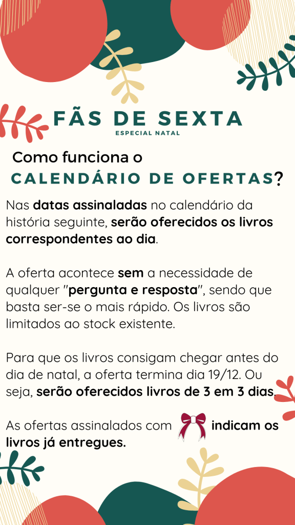 É com grande alegria que vos dou a conhecer que, em dezembro, terão a oportunidade de receber nas vossas casas 6 livros. As quantidades estão mantidas em segredo, assim como qual o livro a ser dado em cada dia. Mas querem saber o melhor? Em dezembro voltamos às origens. Em dezembro ganha quem for o primeiro a comentar (ou os primeiros).