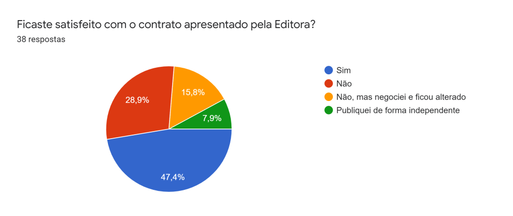 Penso que facilita agregar estes dados por diferentes tópicos e o editorial tem de ser o primeiro. No início deste inquérito, realizado na plataforma Google Forms, podemos verificar que a grande maioria dos autores mostraram satisfação com o contrato. Correspondendo esse valor a 18 autores, somos confrontados com 11 autores que não gostaram do seu contrato, mas o assinaram, contra 6 que conseguiram encontrar um meio-termo e um editor que escutasse. Apesar de, neste inquérito, ter sido uma minoria, foi interessante encontrar três autores que publicaram de forma independente. Algo que, sem dúvida, impacta resultados futuros.
