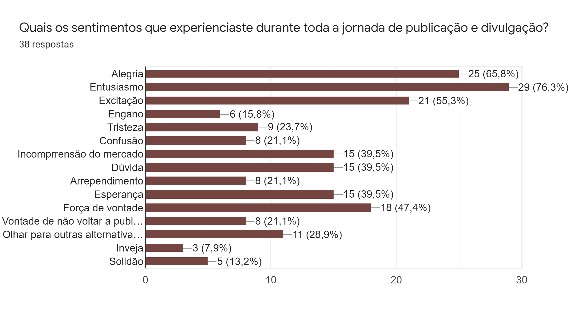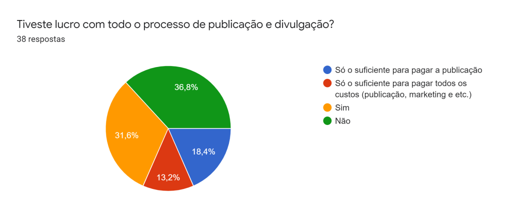A maioria dos autores inquiridos confessou não ter tido lucros (14), onde 12 dos mesmos admitiram que, mesmo com as restantes despesas, conseguiram lucrar com o processo, com o seu trabalho. Em oposto, e se somarmos o setor azul e vermelho, chegamos à conclusão de que precisamente 12 autores tiveram lucro, estando este associado à necessidade de cobrir as despesas tidas.