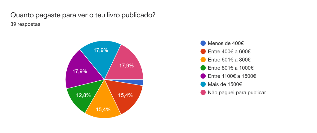 Independentemente disto, podemos retirar dos dados brutos como publicar um livro em Portugal é algo extremamente, mas extremamente, caro. Numa altura onde o salário mínimo não chega perto dos 700€, só um dos autores inquiridos pagou menos de 400€ para ver o seu trabalho editado. Um custo que não é isolado, já que existem autores que pagam para alguém rever o seu manuscrito.