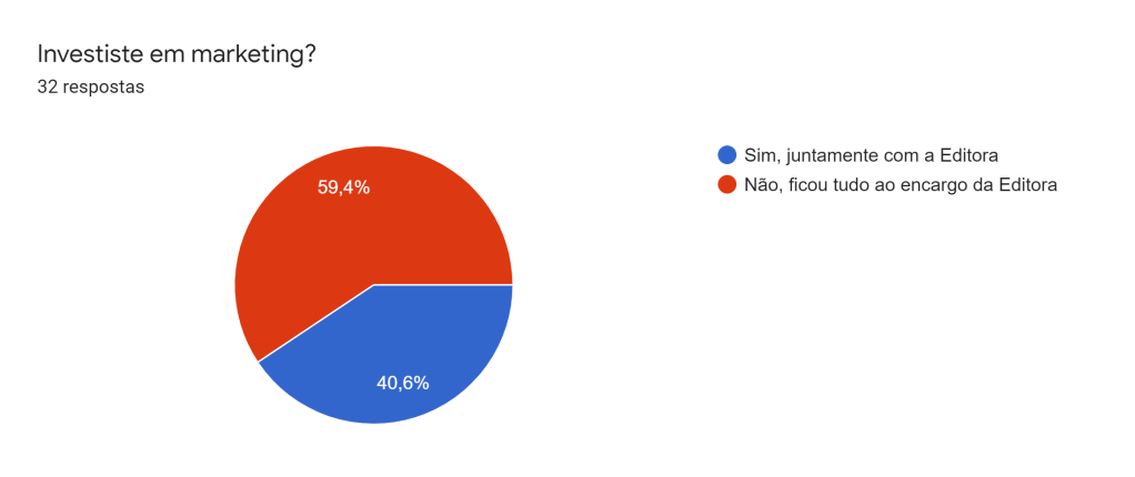 Um livro, sem marketing, não sobrevive. É cada vez mais o autor, após a publicação, que assegura o “passa a palavra” e que tenta que o seu livro não caia no esquecimento. Num mercado onde são publicados mais livros àqueles que são lidos, investir torna-se obrigatório. Algo que tanto pode ficar a exclusivo encargo da editora, do autor ou, em quase todos os casos, de ambos. No caso destes autores, estes assumem ter sido a editora a maior responsável pelo marketing. Agora, o que se retém disto é que, mesmo que se tenha investido na publicidade conjunta com a editora, no gráfico seguinte os autores admitiram que acabaram por gastar do próprio bolso no que toca à promoção.