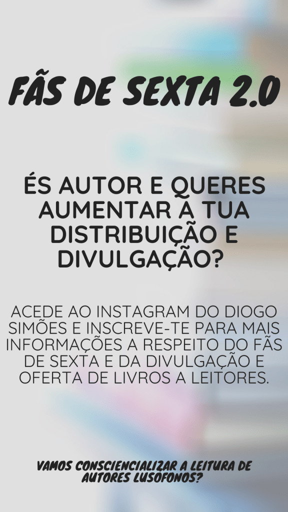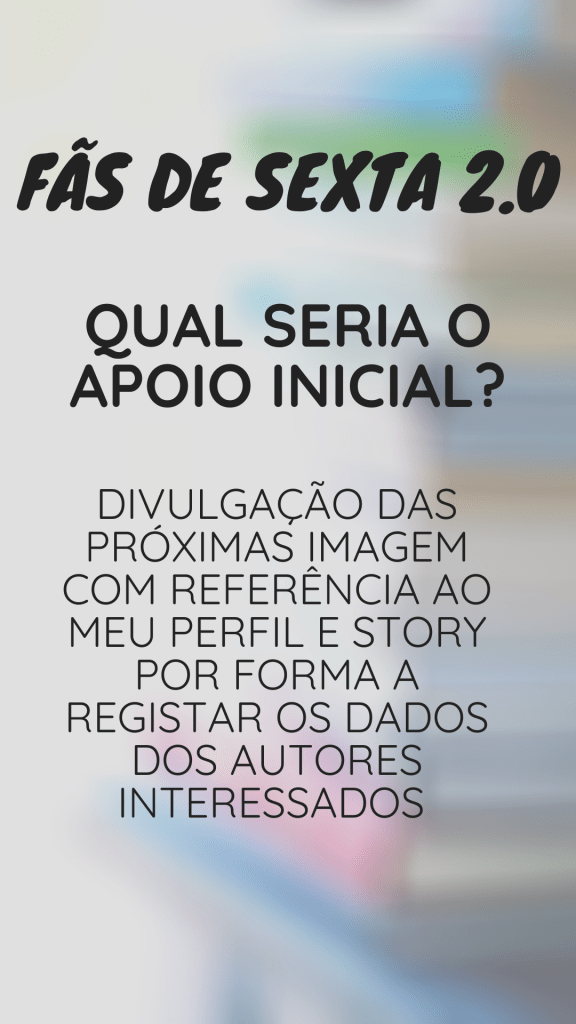 Assim, a vossa ajuda passa por “promover” o projeto ao procurar autores que possam estar interessados para que eu lhes apresente o projeto. Após isto, é só pedido que na primeira sexta-feira de cada mês, publiquem pelo menos uma história no Instagram com os livros a serem oferecidos. Quanto mais autores, mais stock irá existir.